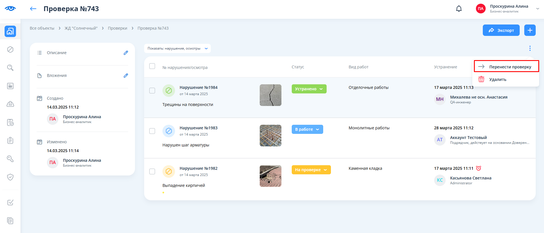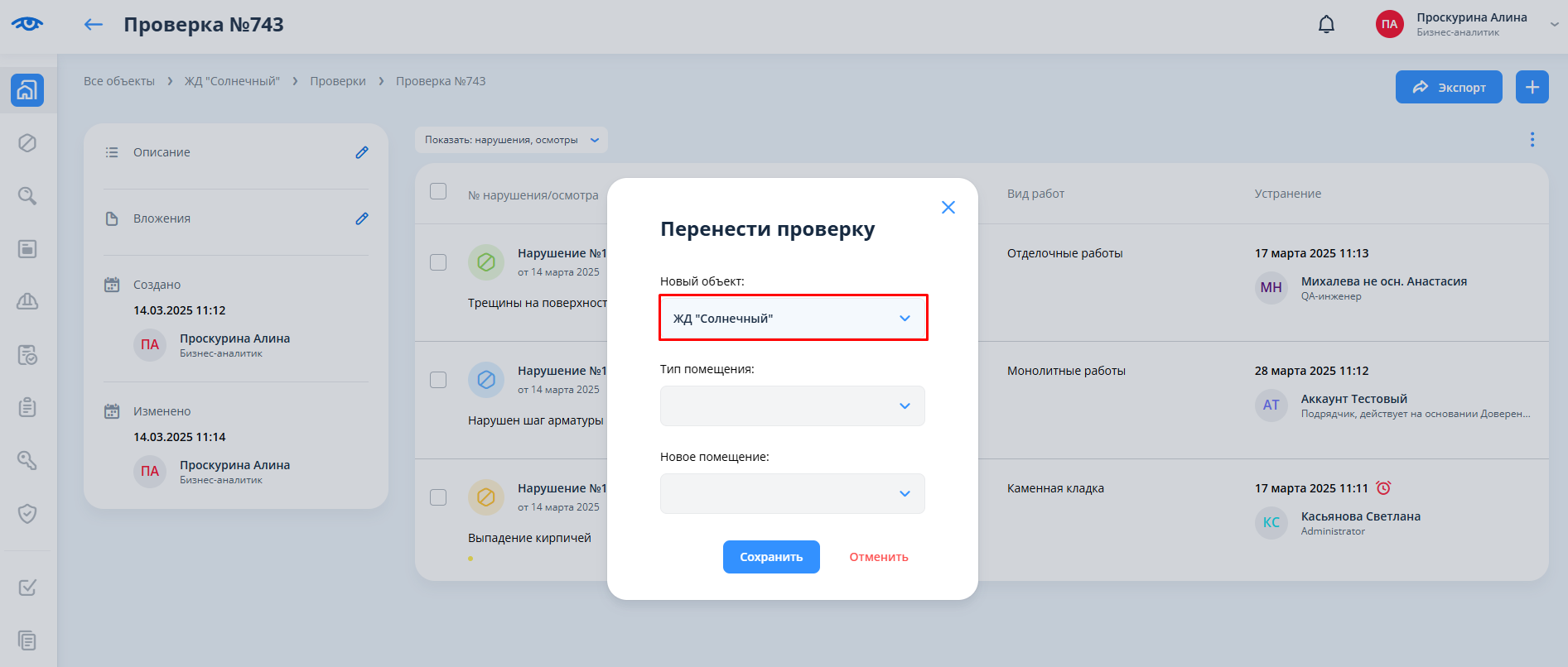 Если проверка, которая привязана к помещению, перемещается из одного объекта в другой, то в случае несовпадения наборов видов работ, наборов меток или рабочих групп у этих объектов соответствующие поля нарушений, которые находятся в проверке, не сбрасываются после перемещения проверки, показываются в карточках нарушений, однако при редактировании нарушений эти поля будут пустыми.