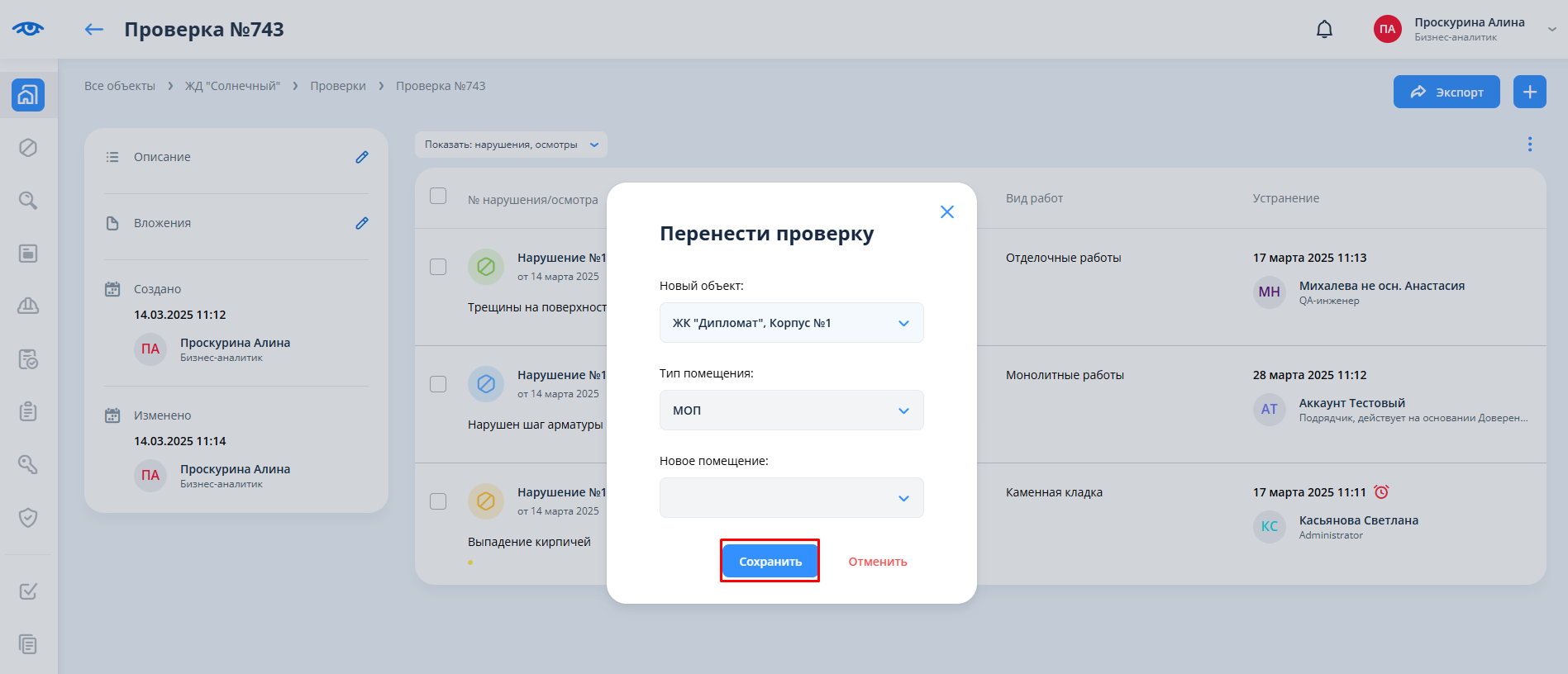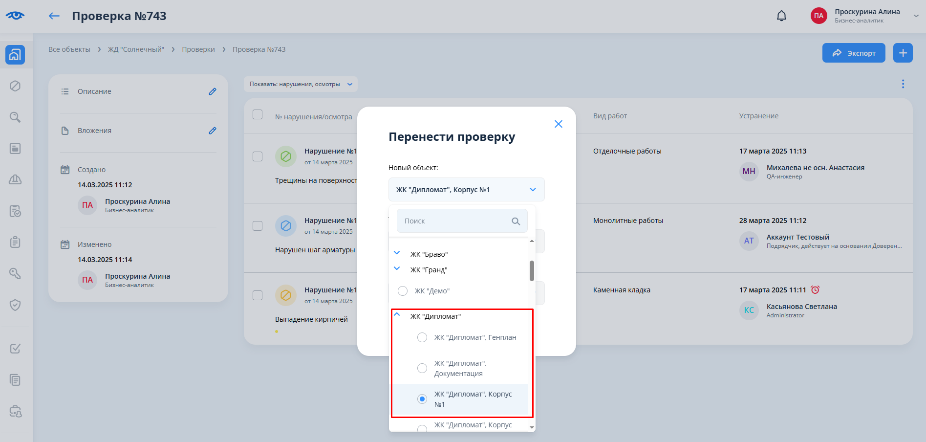 Суть: функционал позволяет перемещать проверки вместе с находящимися в них нарушениями и осмотрами из одного объекта в другой, если проверка привязана к объекту, и из одного помещения в другое любого объекта, если проверка привязана к помещению.