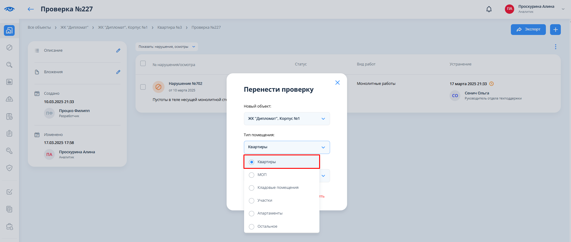 Если требуется переместить проверку в помещение другого типа, то необходимо кликнуть на поле “Тип помещения” и из выпадающего списка выбрать нужный (на примере ниже - тип помещения “Квартира”).
