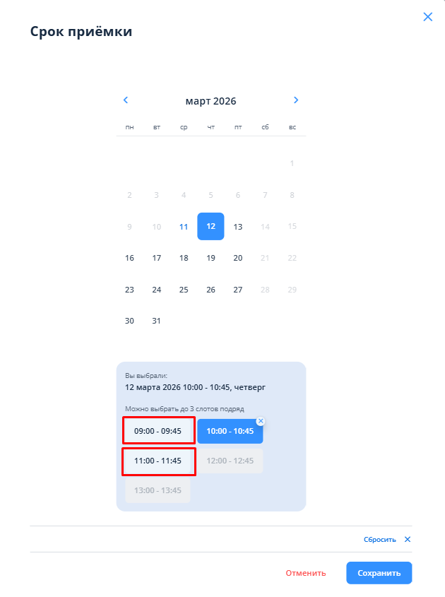 • Конец приёмки — время окончания последнего выбранного слота.