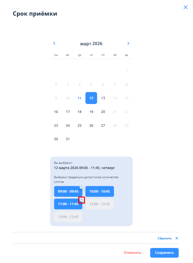 Если требуется сбросить выбранный ранее слот, то необходимо нажать на крестик 🞪 на нужном слоте. При этом, убрать можно только крайний слот в цепочке — самый первый или самый последний по времени, возможность сброса на среднем (-их) слоте (-ах) отсутствует.