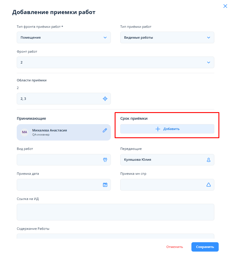 При добавлении приемки работ требуется заполнить необходимые поля и перейти к выбору срока приемки путем нажатия на кнопку "+ Добавить" в соответствующем поле.