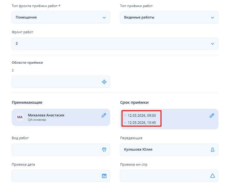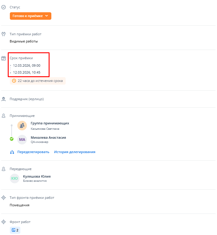 В карточке приемки поле "Срок приемки" так же отображается общий временной интервал: