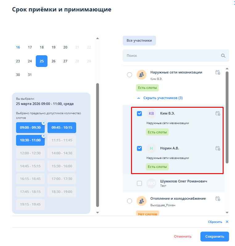 Множественный выбор слотов доступен также в объединенном окне выбора срока и принимающих.