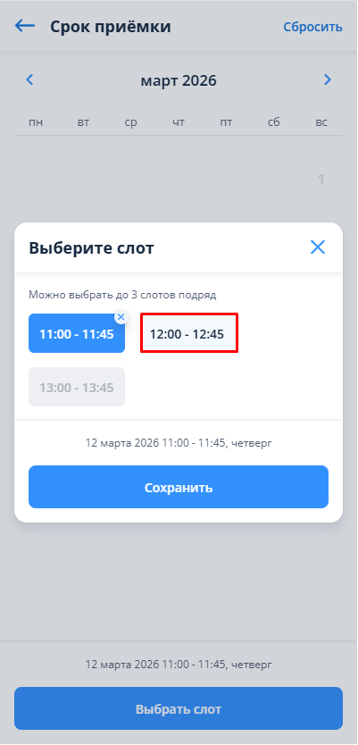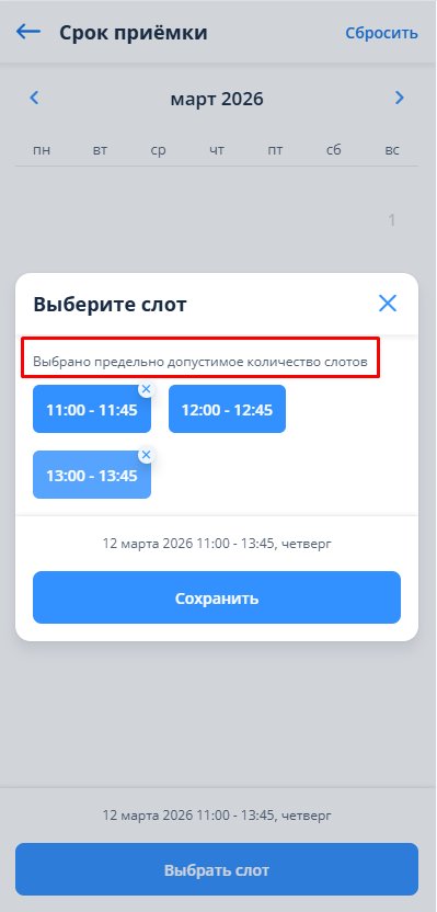 Если выбрано максимальное количество слотов под выбранным днем в календаре, то все остальные слоты автоматически станут неактивными, а сверху появится подсказка: «Выбрано предельно допустимое количество слотов».