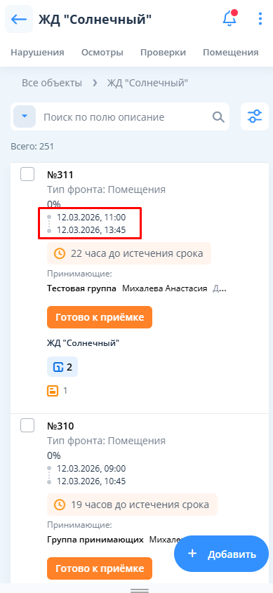 При добавлении приемки работ требуется заполнить необходимые поля и перейти к выбору срока приемки путем нажатия на кнопку "+ Добавить" в соответствующем поле.