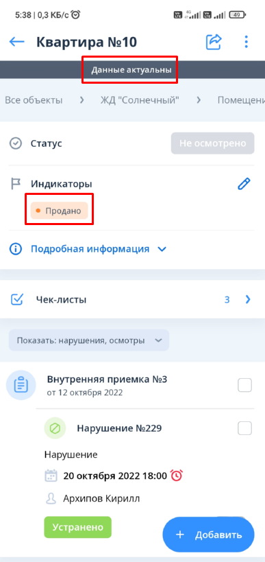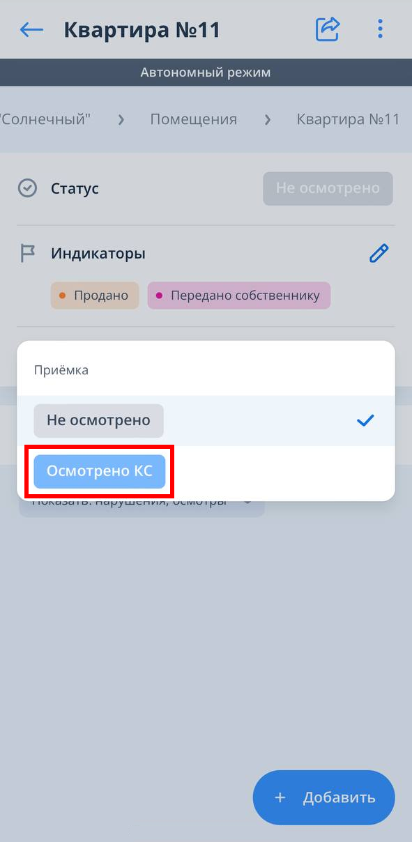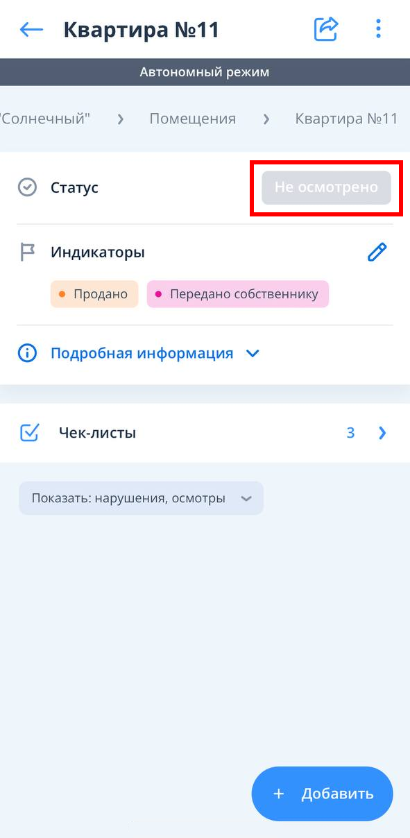 Если добавление нарушения или осмотра в рамках объекта/помещения на текущий день происходит не в первый раз, то в окне создания нарушения или осмотра выбрана последняя созданная проверка/внутренняя приемка/передача собственнику/гарантийное обращение, поскольку для автономной работы кэшируются и родительские сущности.