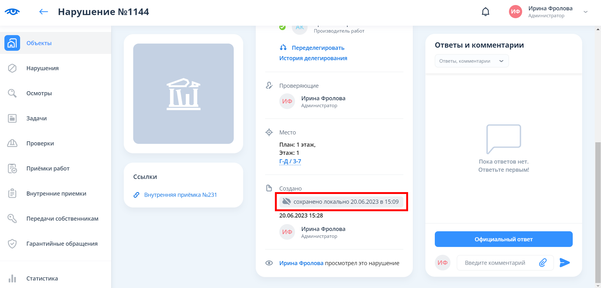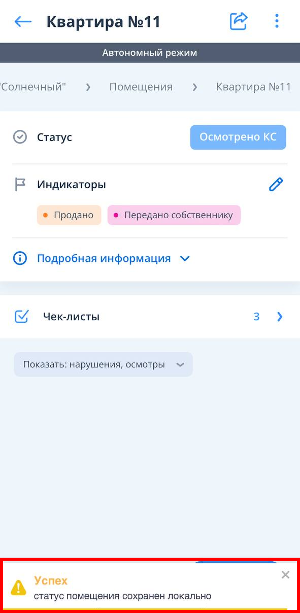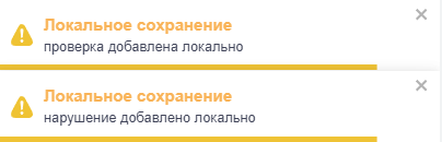 После сохранения нарушения появится всплывающая надпись «Нарушение сохранено локально». Если при создании нарушения создавалась новая проверка/внутренняя приемка/передача собственнику/гарантийное обращение, то об этом проинформирует вторая всплывающая надпись.