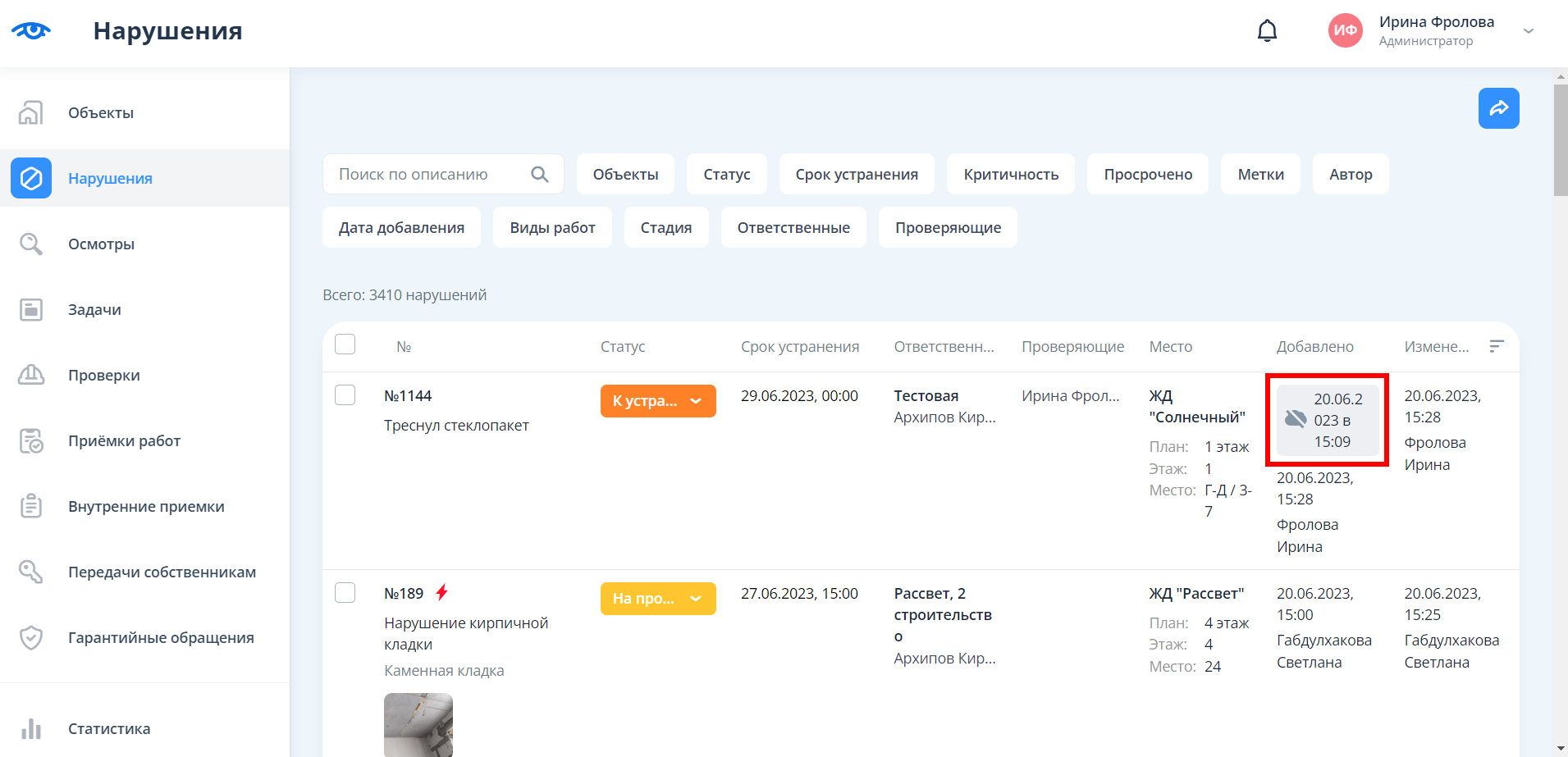 • Фиксировать нарушения/осмотры на объекте и в помещениях объекта на всех стадиях;