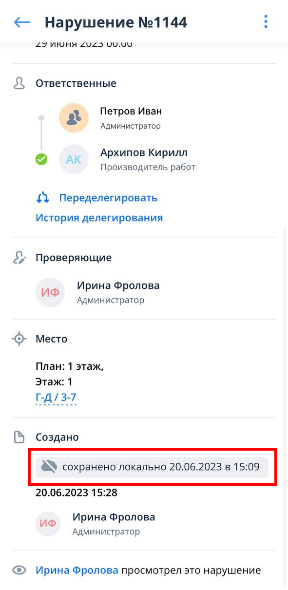 В карточке нарушения фиксируется фактическая дата и время создания локального нарушения, если время между созданием и загрузкой нарушения на сервер превысило 10 минут. В строчке “Создано” на серой плашке указывается дата и время создания нарушения локально и дата и время передачи этого нарушения на сервер.
