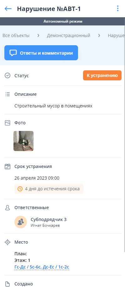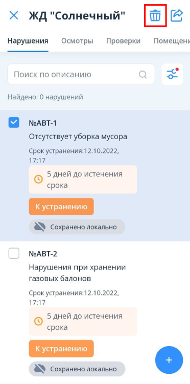 В автономном режиме доступен просмотр карточки локально созданного нарушения. Для внесения изменений необходимо кликнуть на нужное нарушение.