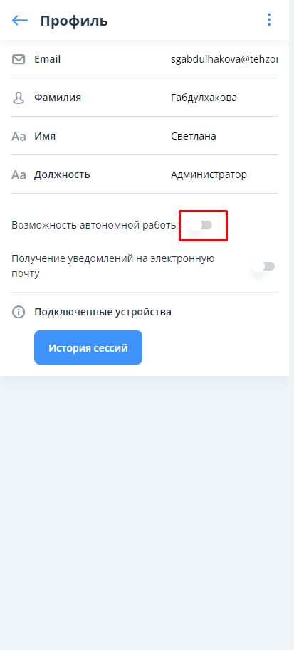 Состояние переключателя возможности работы в автономном режиме хранится локально на устройстве. Если пользователь авторизуется в системе с другого устройства, то в профиле пользователя тумблер следует переключить заново.