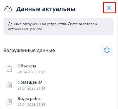 Если необходимо самостоятельно актуализировать данные, в окне кэширования (при наличии подключения к Интернету) необходимо нажать на значок обновления. После данного действия объекты со всеми данными загрузятся заново с указанием даты и времени обновления, на которые впоследствии можно будет ориентироваться.
