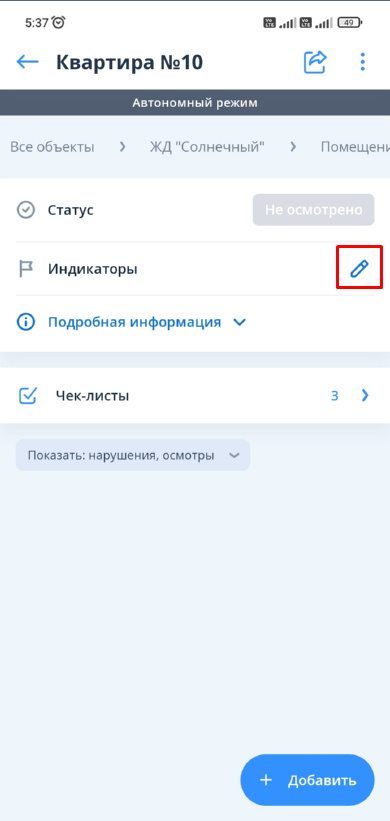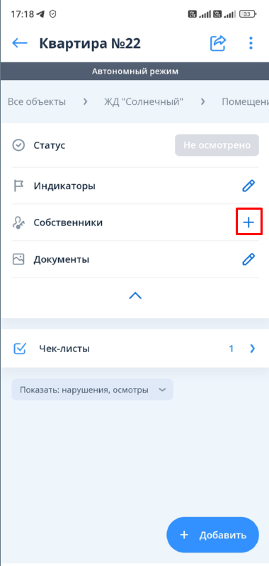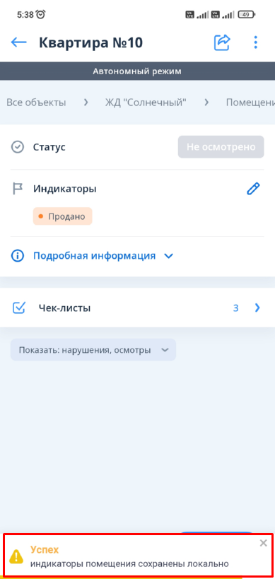 Работа с чек-листами помещений в автономном режиме