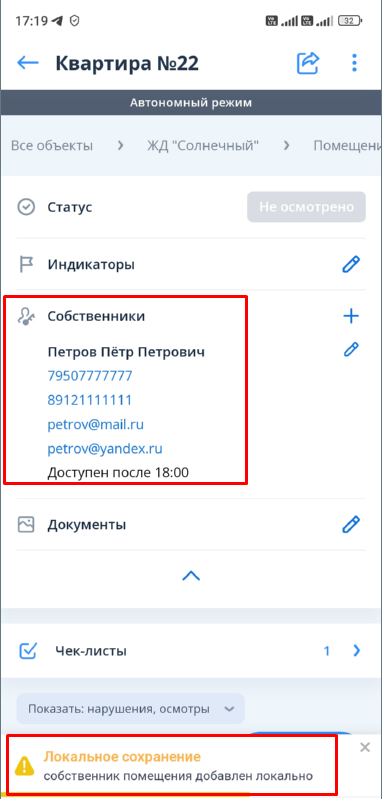 После нажатия на кнопку сохранения открывается карточка помещения и уведомление о том, что собственник сохранен локально.