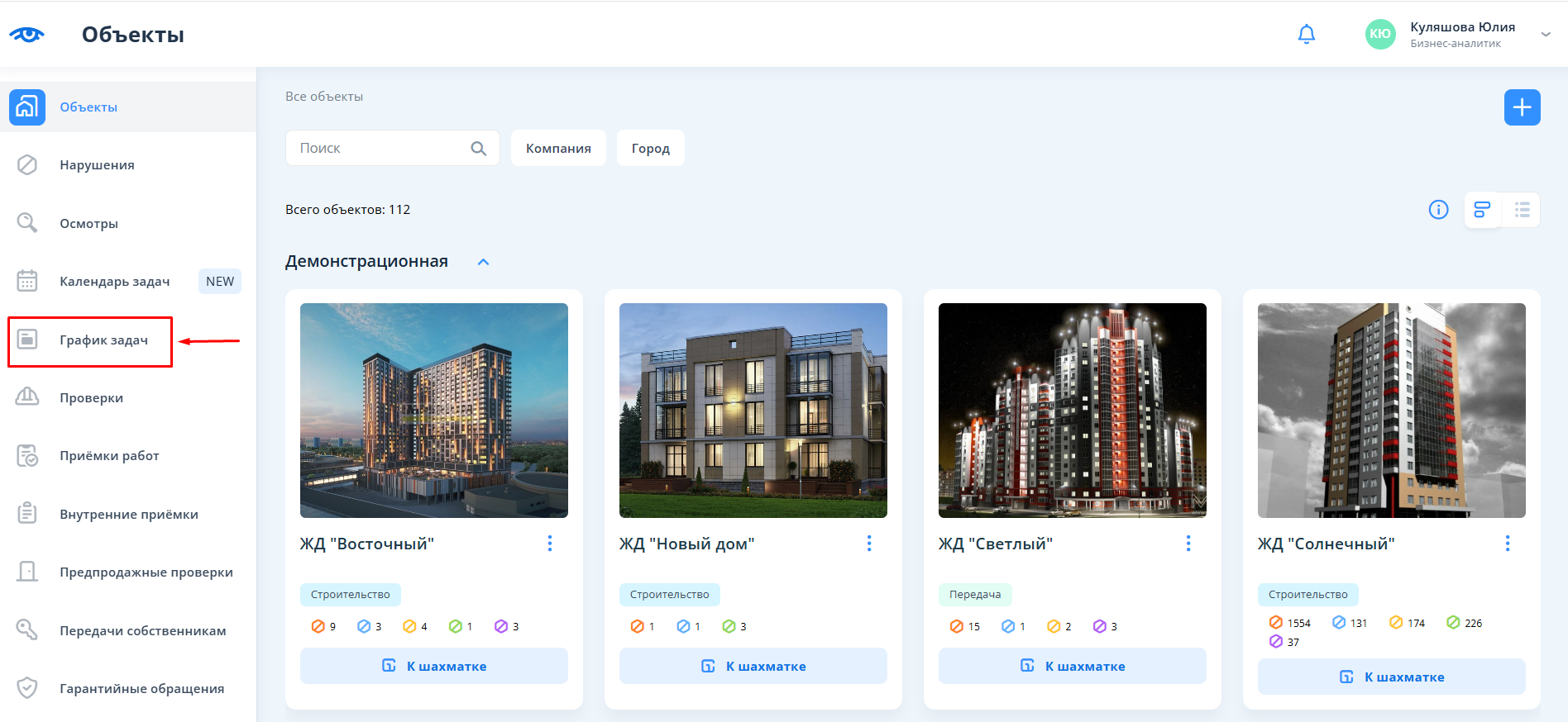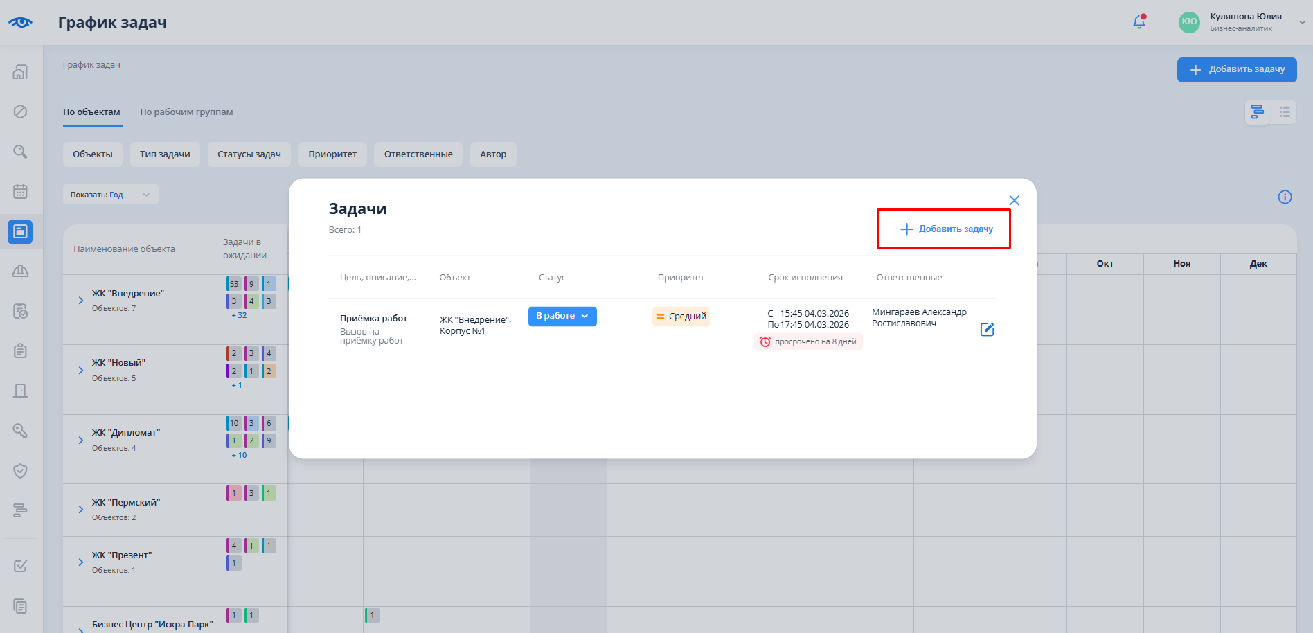Для того, чтобы перейти в график задач, пользователю необходимо в основном меню нажать на раздел “График задач”.