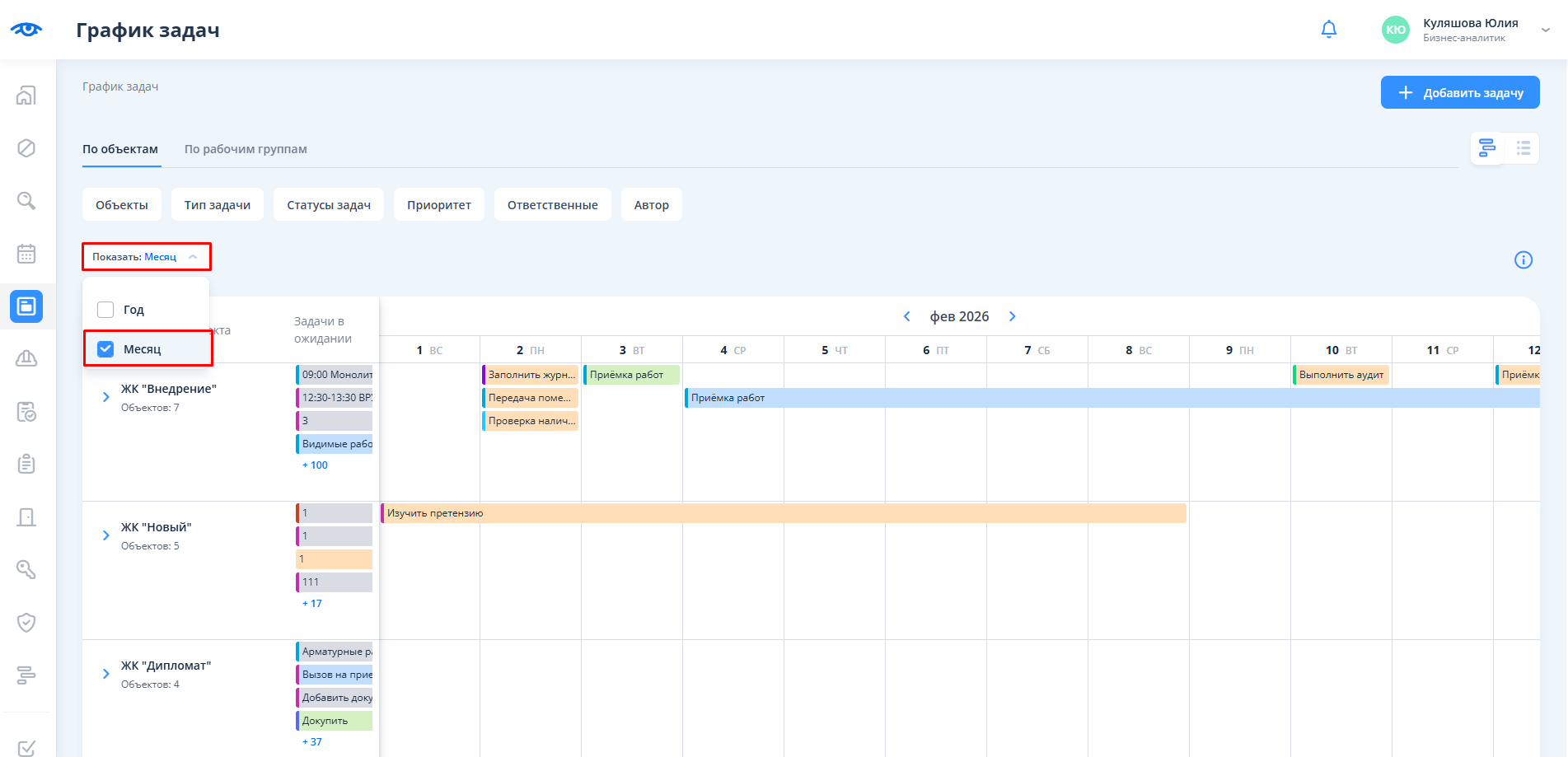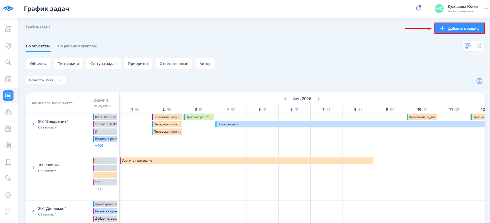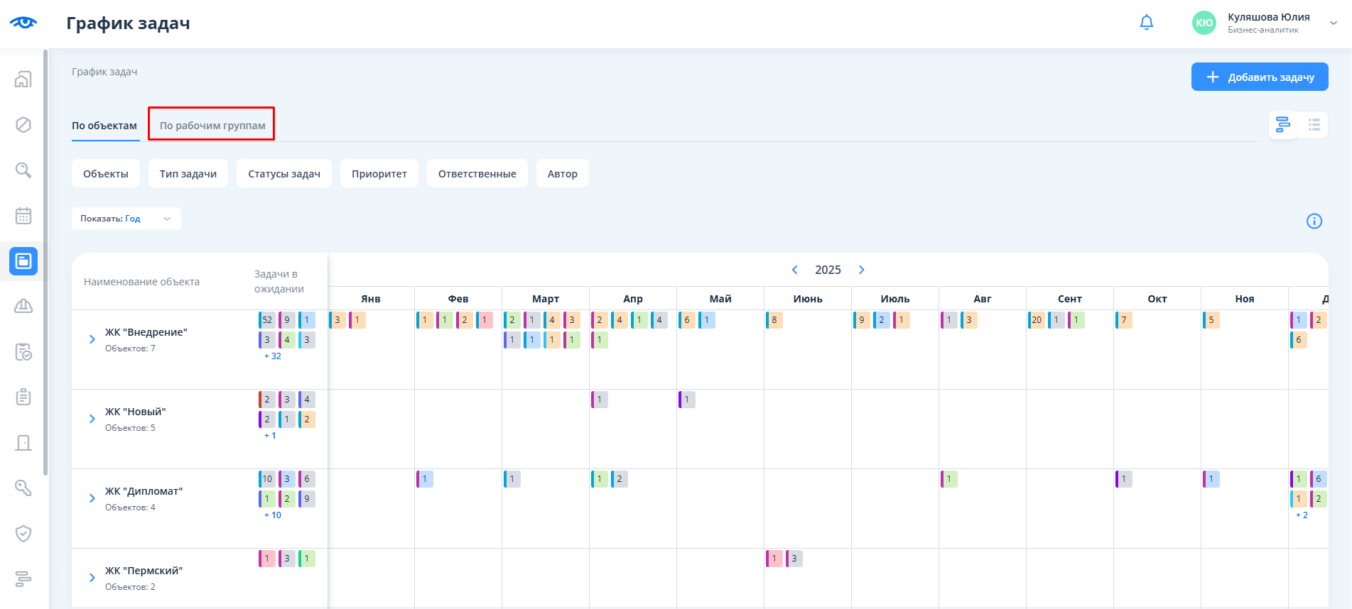 После перехода отображается календарь с разбиением на объекты и месяцы. Для перехода в календарь задач необходимо кликнуть на текст “По рабочим группам”.