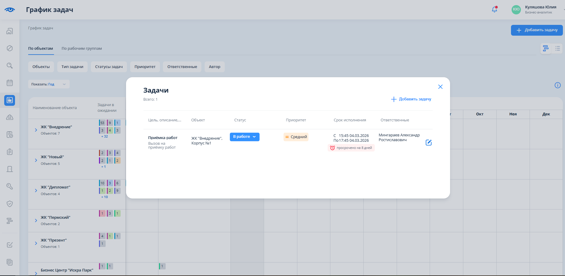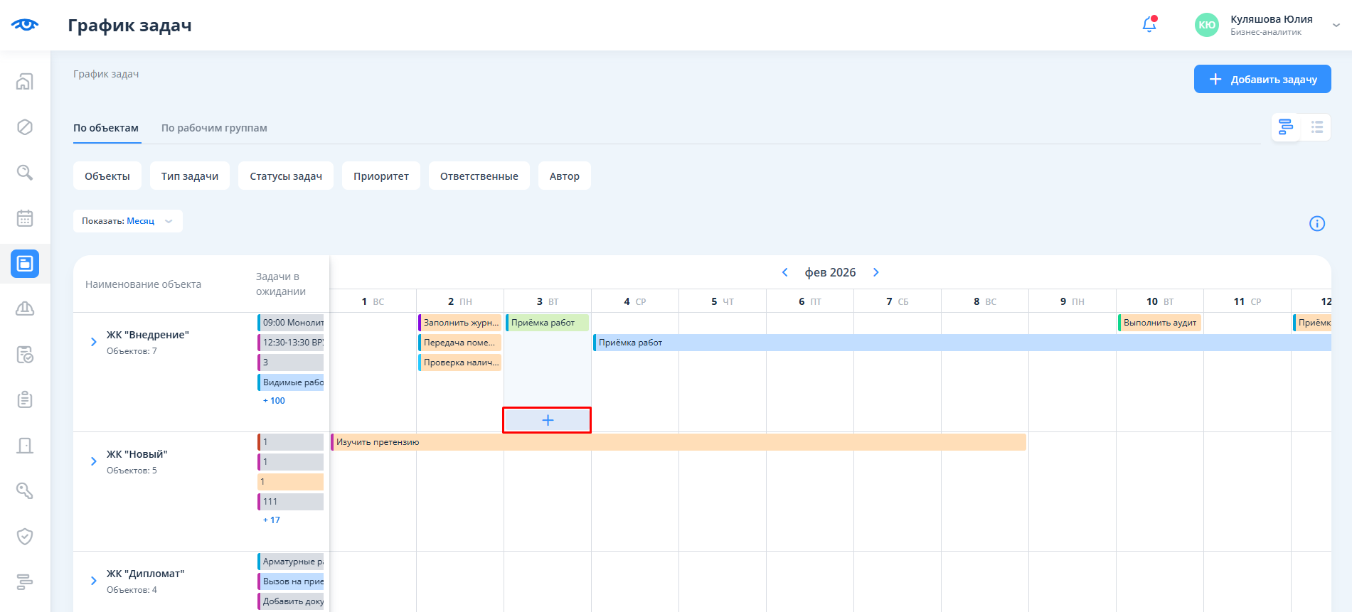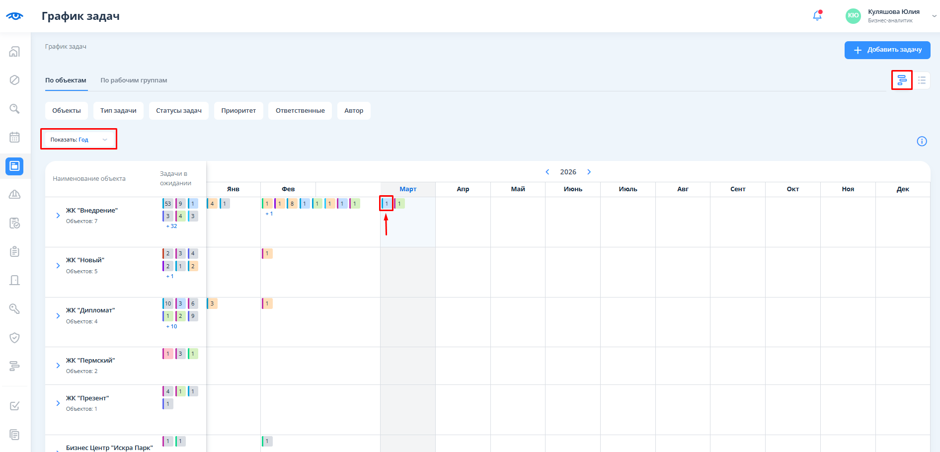 После перехода отображается календарь с разбиением на объекты и месяцы. Для перехода в календарь задач необходимо кликнуть на текст “По рабочим группам”.