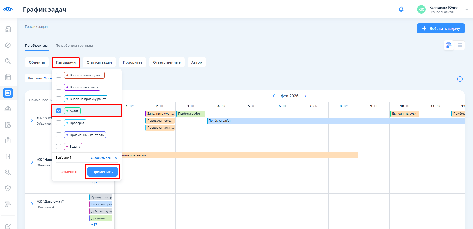 Тип задачи (нужно выбрать тип задачи: "Вызов по помещению", "Вызов по чек-листу", "Вызов на приемку работ", "Задача", "Аудит", "Приемочный контроль", "Проверка");