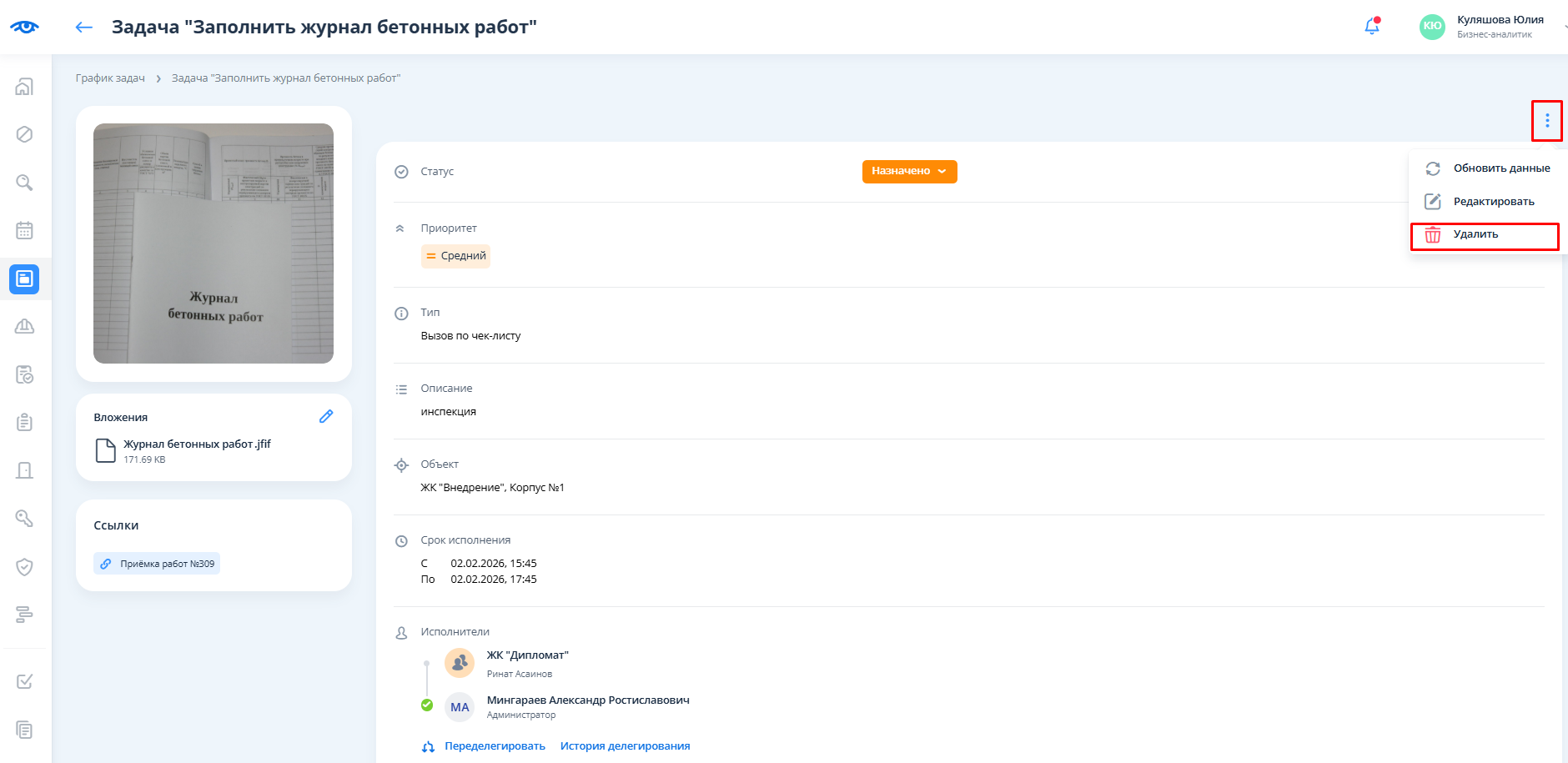 Удаление задачи доступно из реестра задач и из карточки задачи.