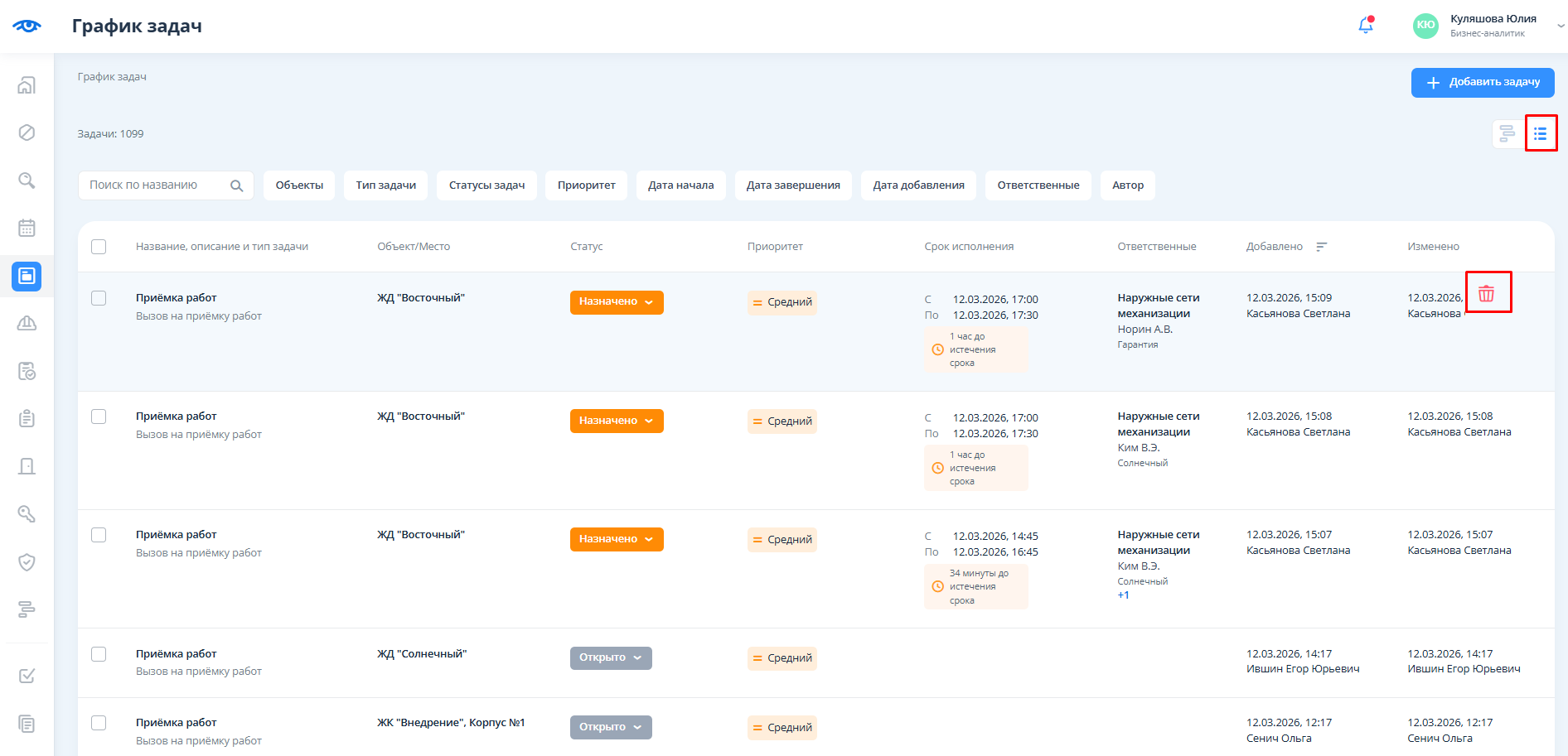 Для удаления из реестра задач следует навести курсор мыши на нужную задачу и нажать на кнопку удаления.