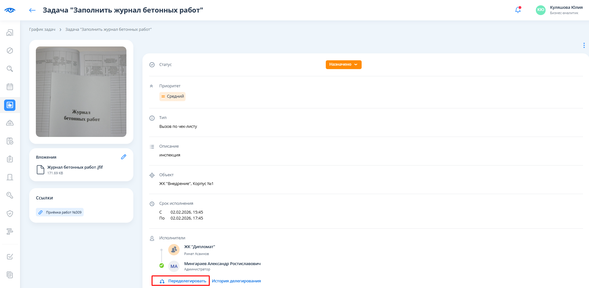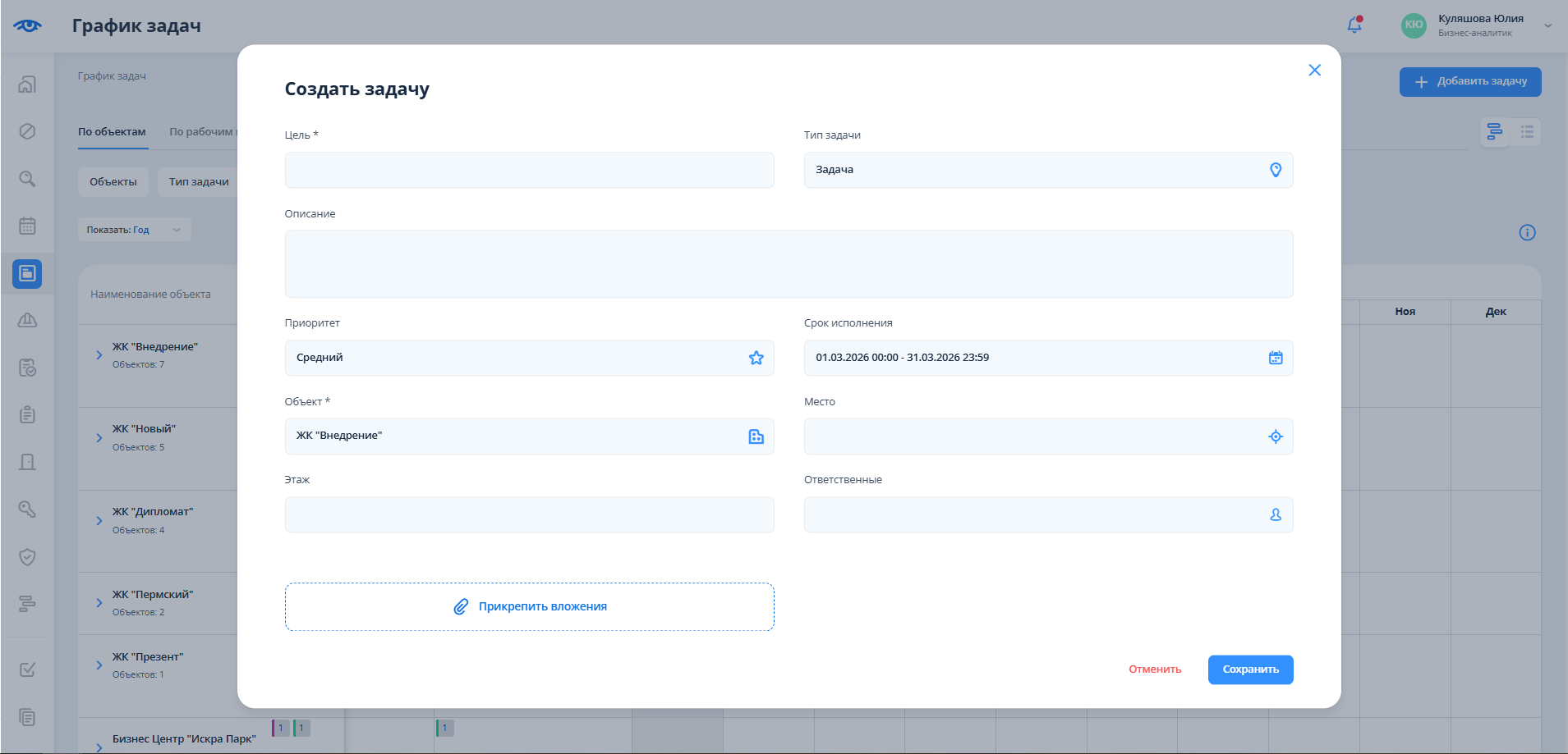 В окне создания задачи поля “Тип задачи”, "Объект", "Приоритет", "Срок исполнения" будут заполнены автоматически, при необходимости значения можно изменить. Следует заполнить все поля и нажать на кнопку сохранения.