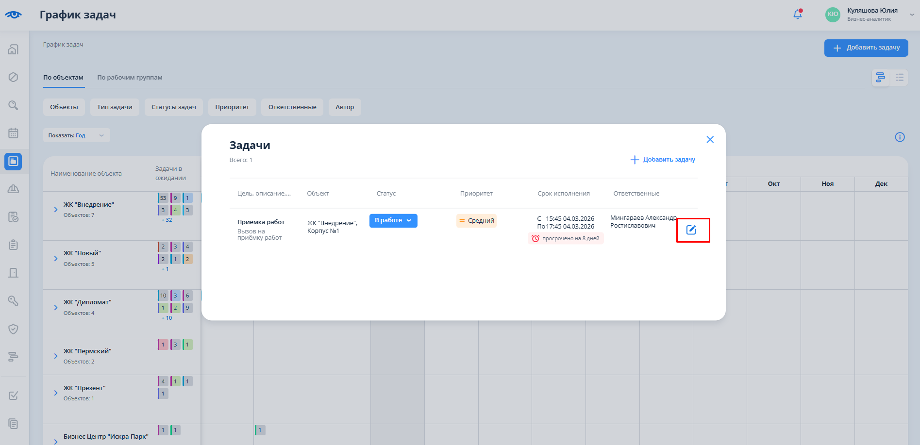 Для редактирования задачи из списка следует нажать на кнопку редактирования, расположенную справа.