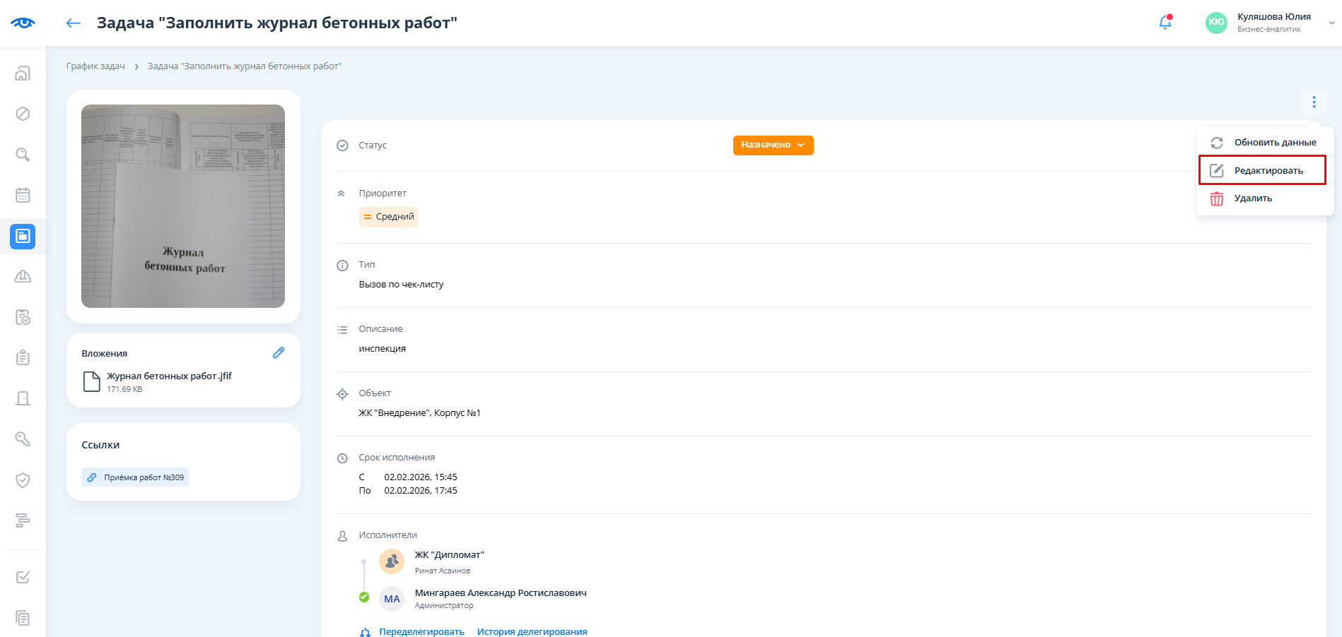 После этого необходимо внести изменения в поля задачи и нажать на кнопку сохранения.
