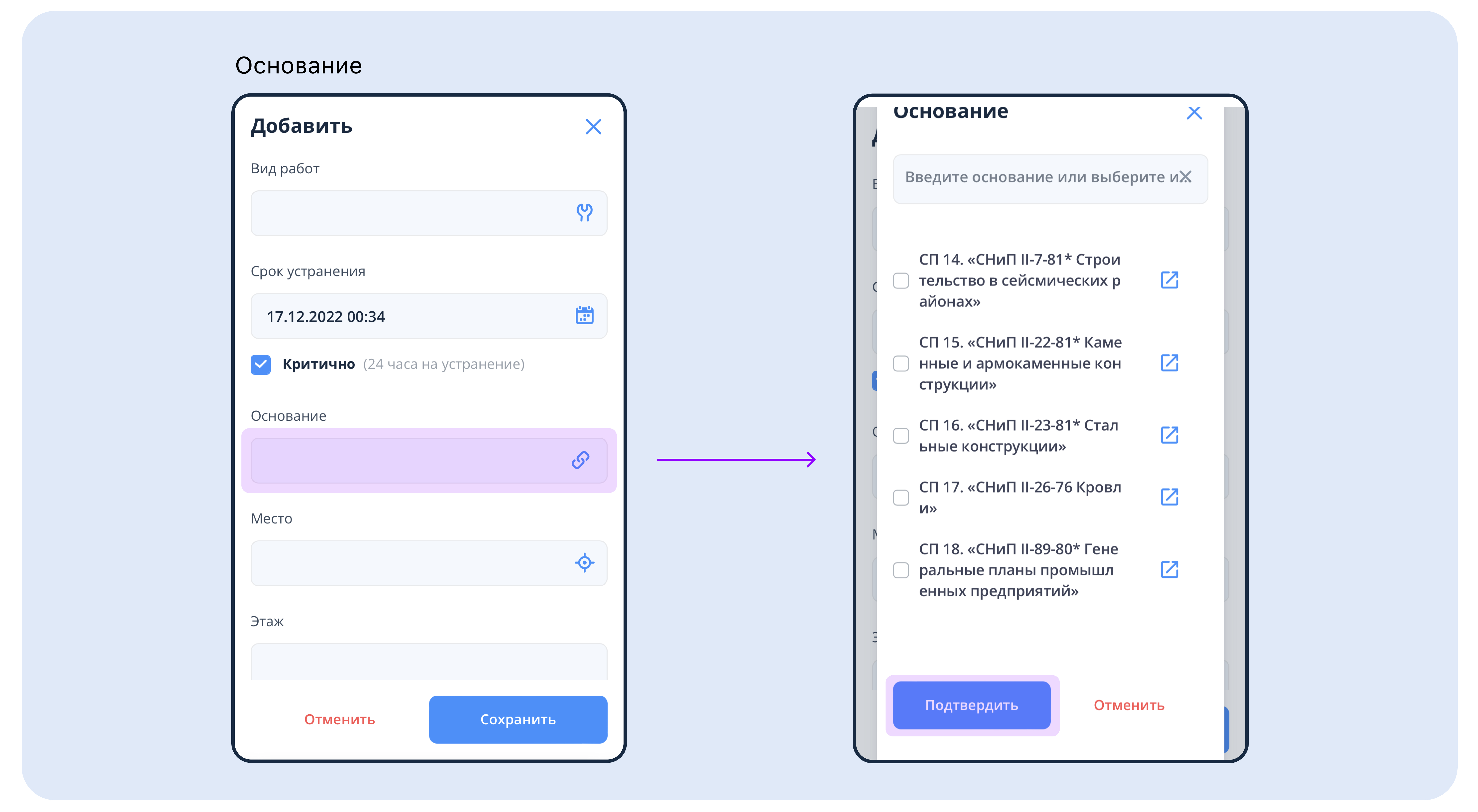 Основание - в этом поле указывается ссылка на конкретный нормативный документ. Необходимо выбрать нужный. В этом же поле можно ссылаться на любые внутренние регламенты, просто вводя нужный текст в поле поиска;