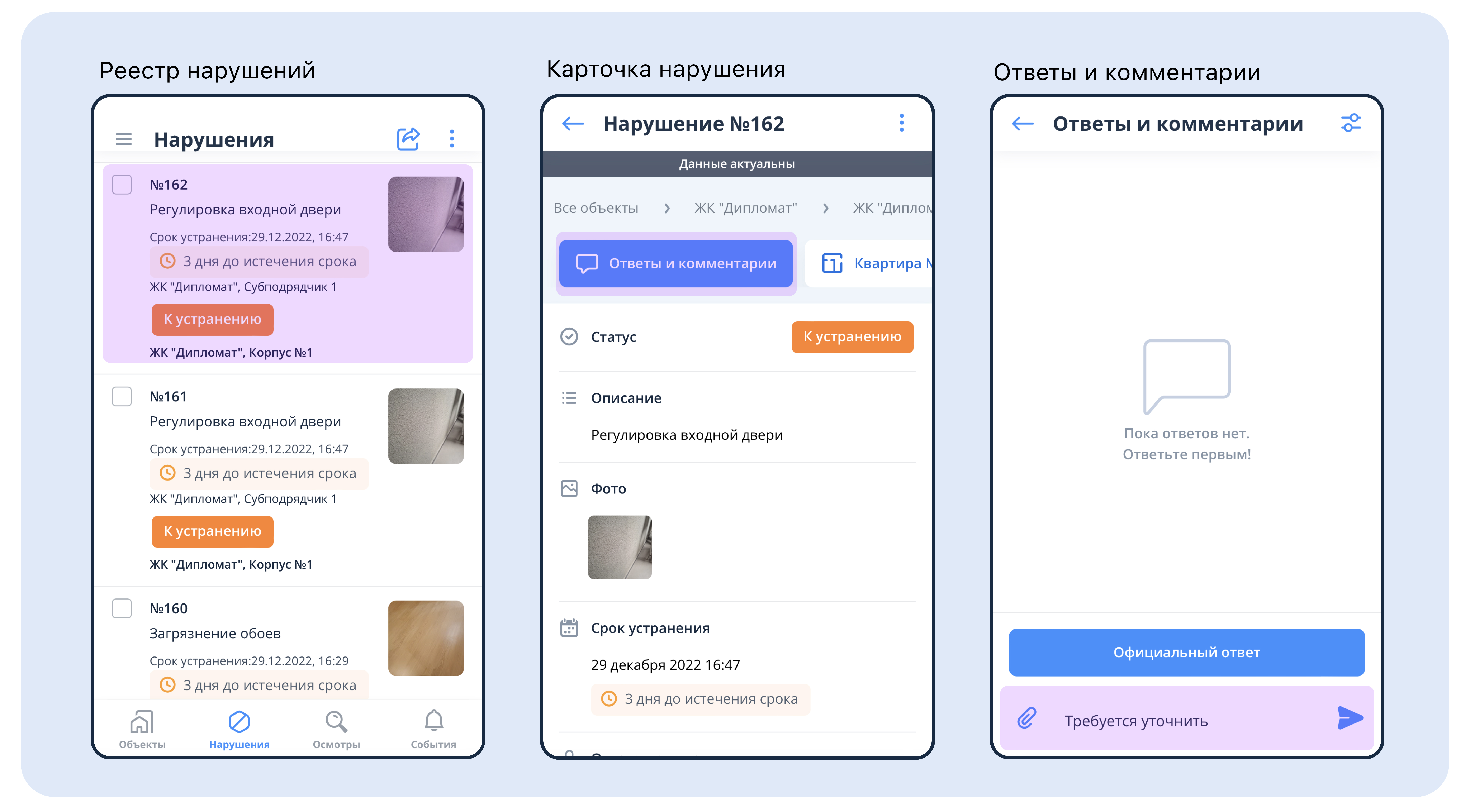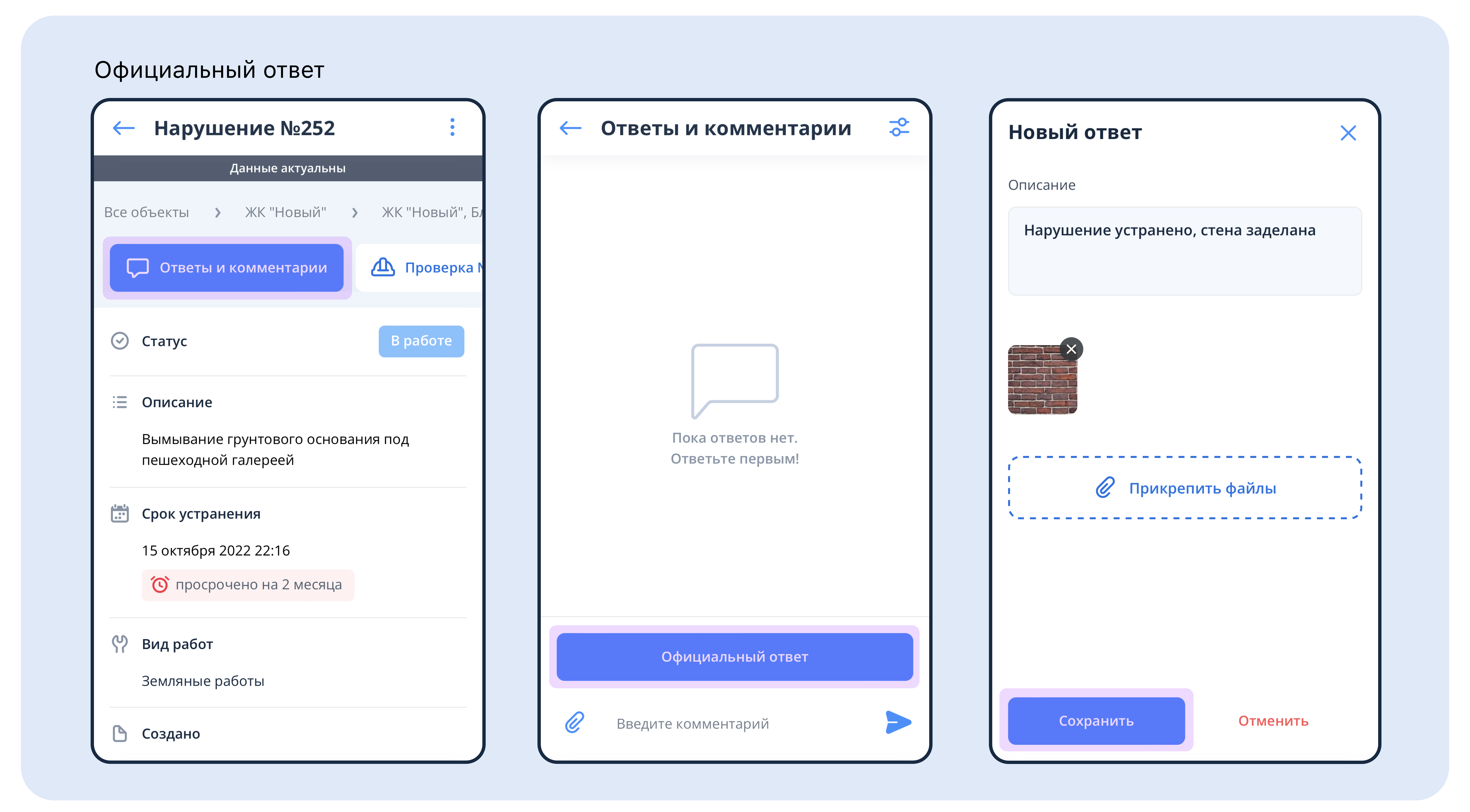 После устранения нарушения нужно его открыть, зайти в “Ответы и комментарии”, нажать на кнопку “Официальный ответ”, заполнить поле “Описание” и обязательно приложить фотографию устраненного нарушения (для того, чтобы у автора нарушения была возможность принять работу)