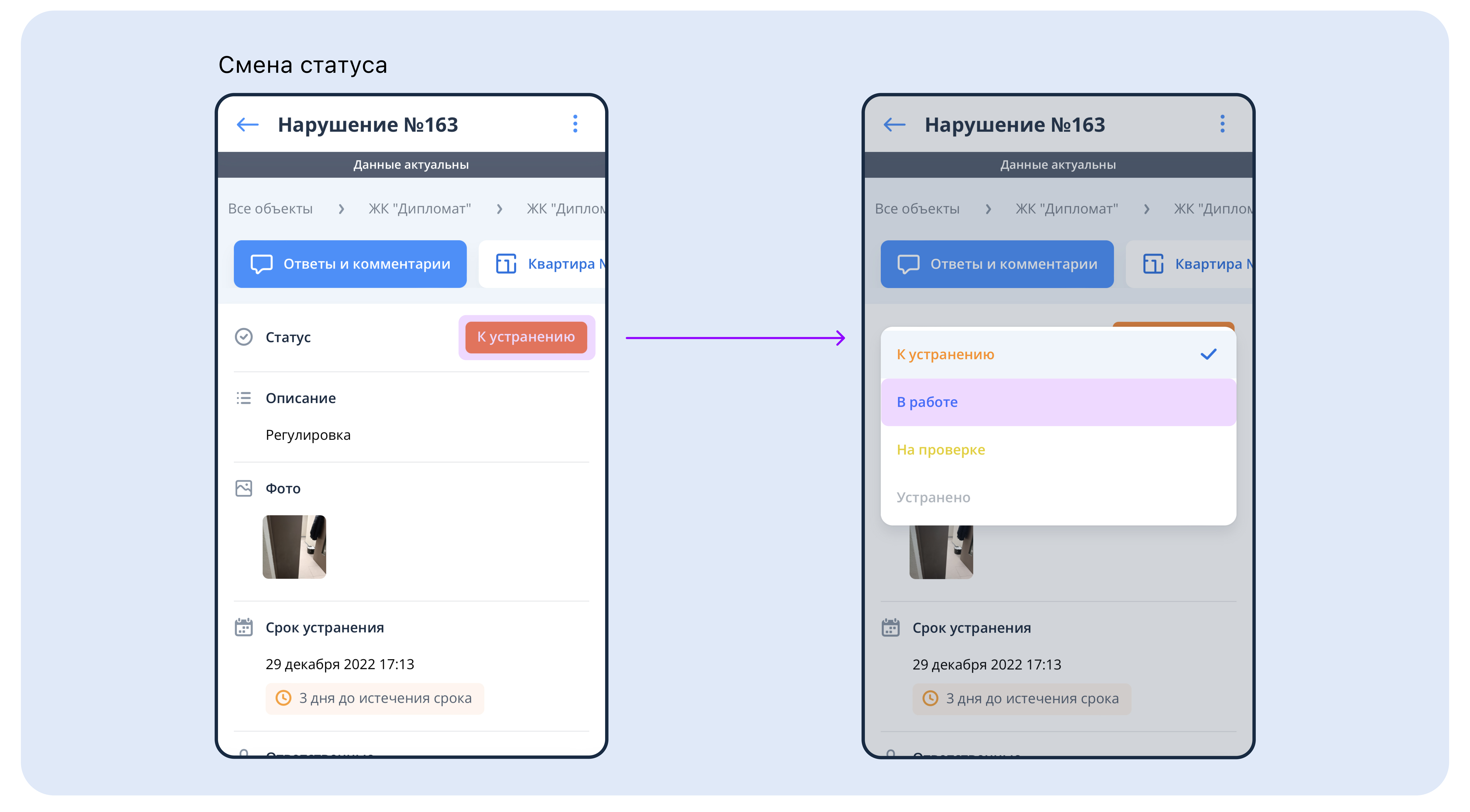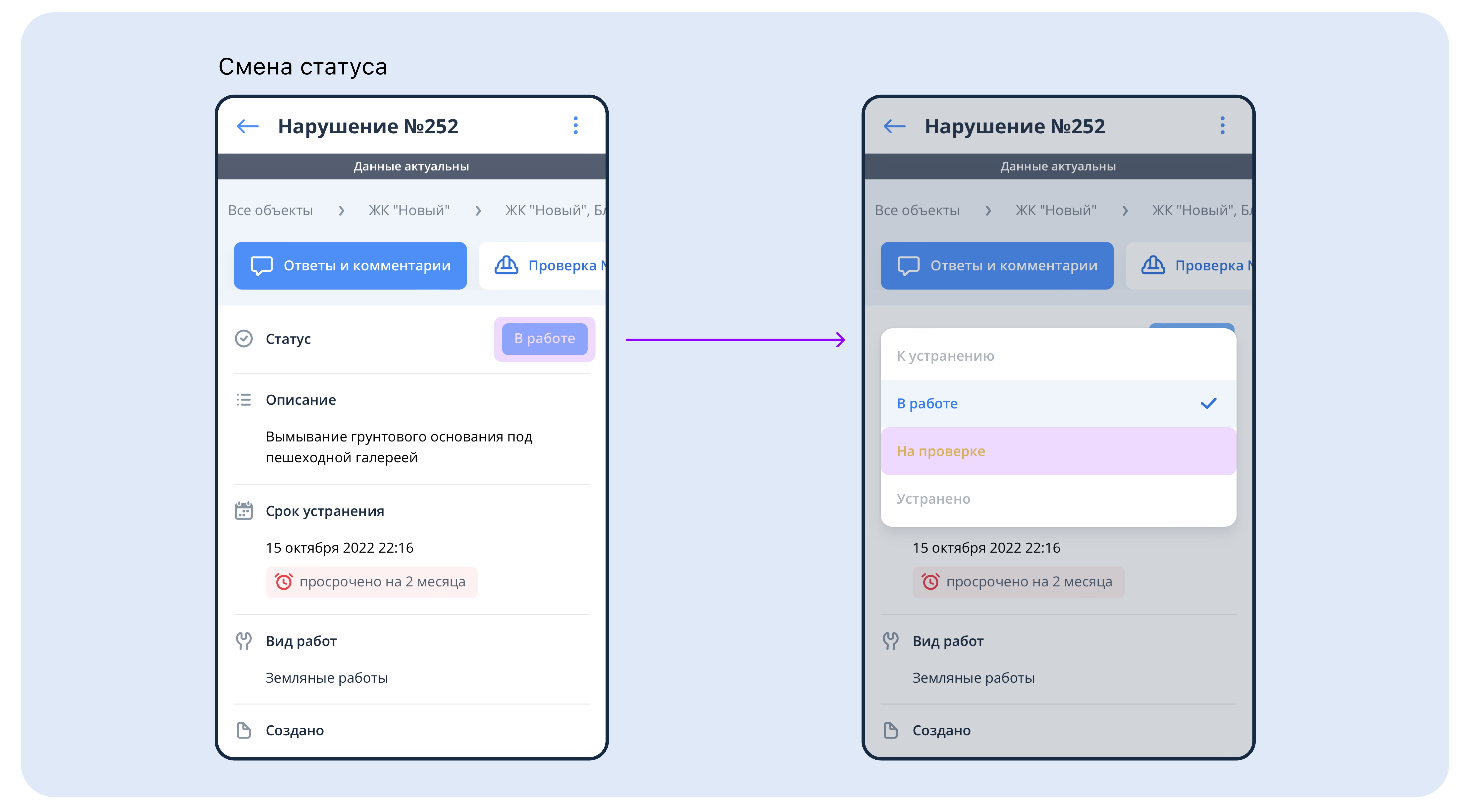 После того как начаты работы по устранению нарушения, необходимо сменить статус нарушения на “В работе”