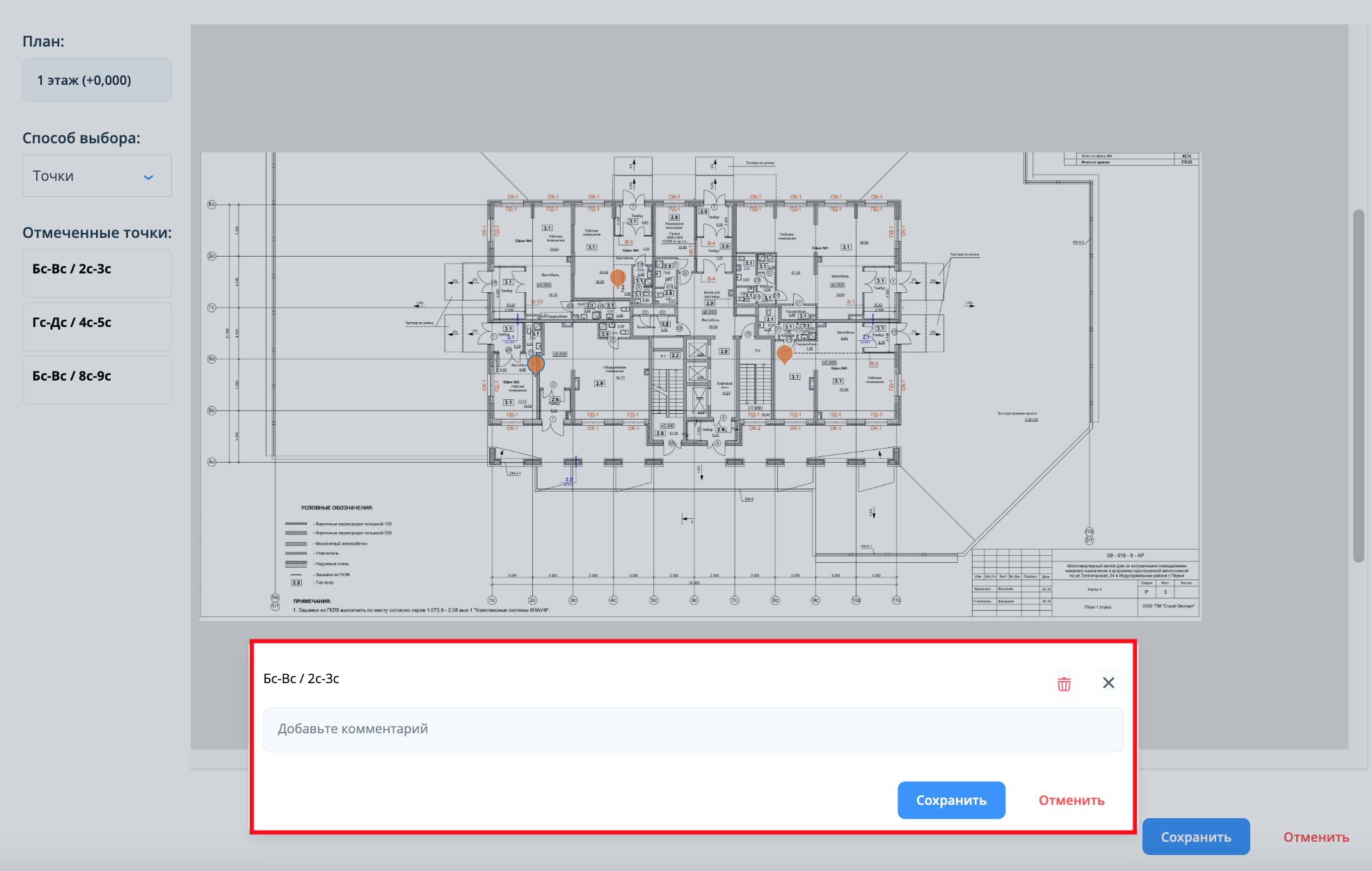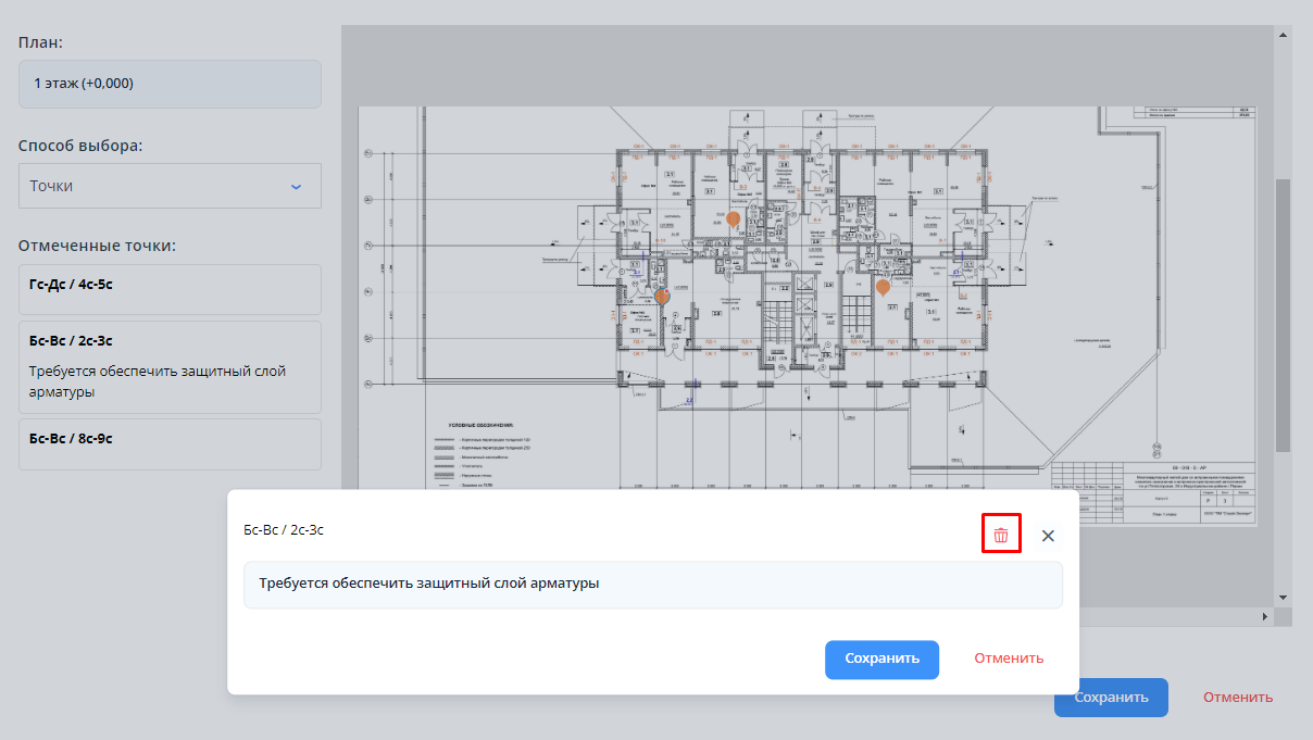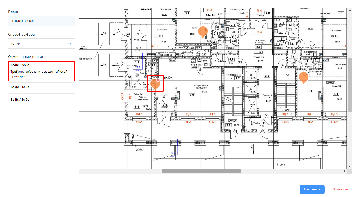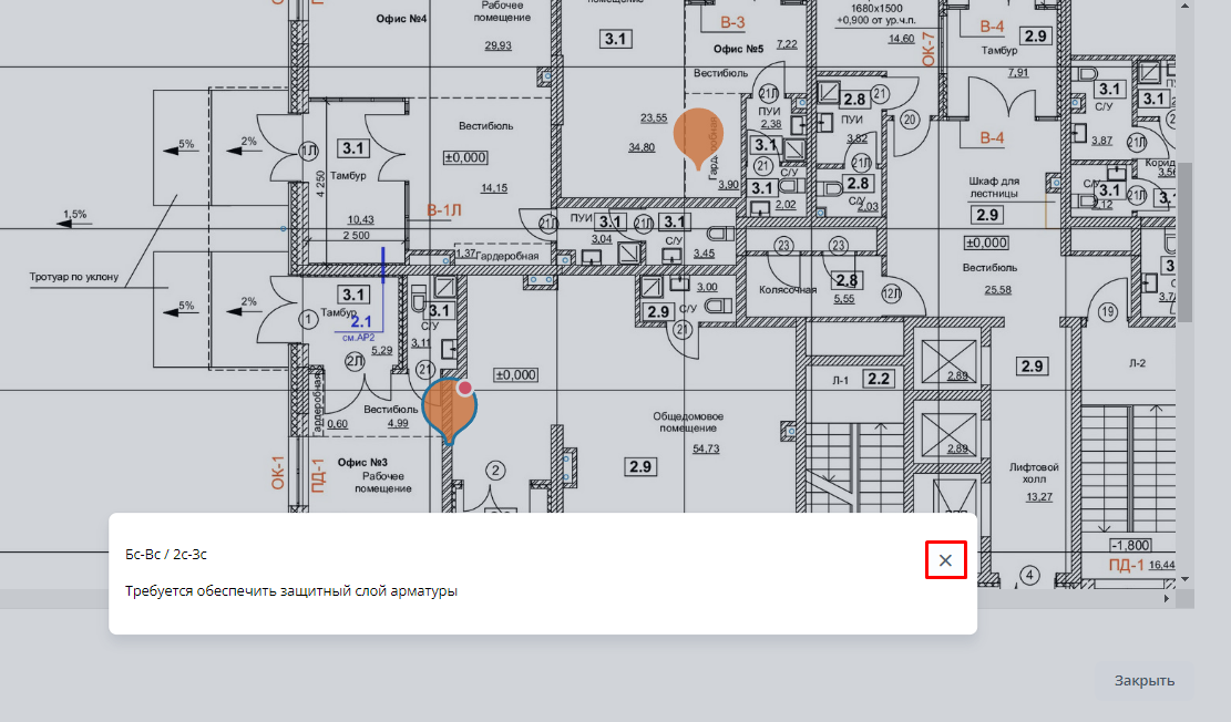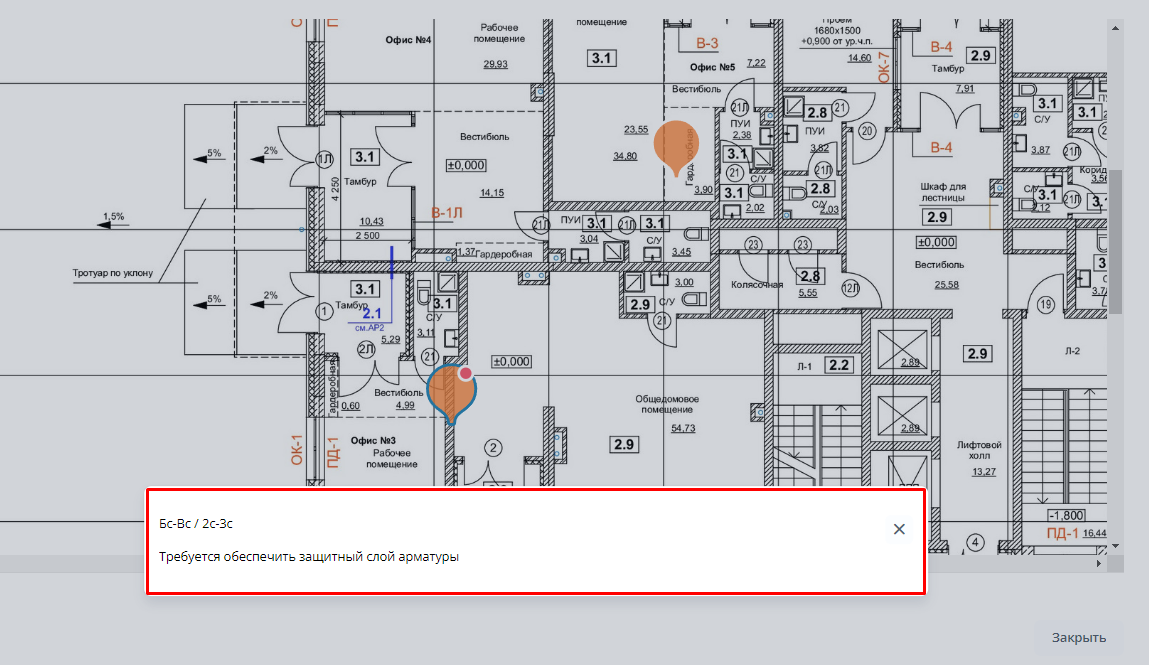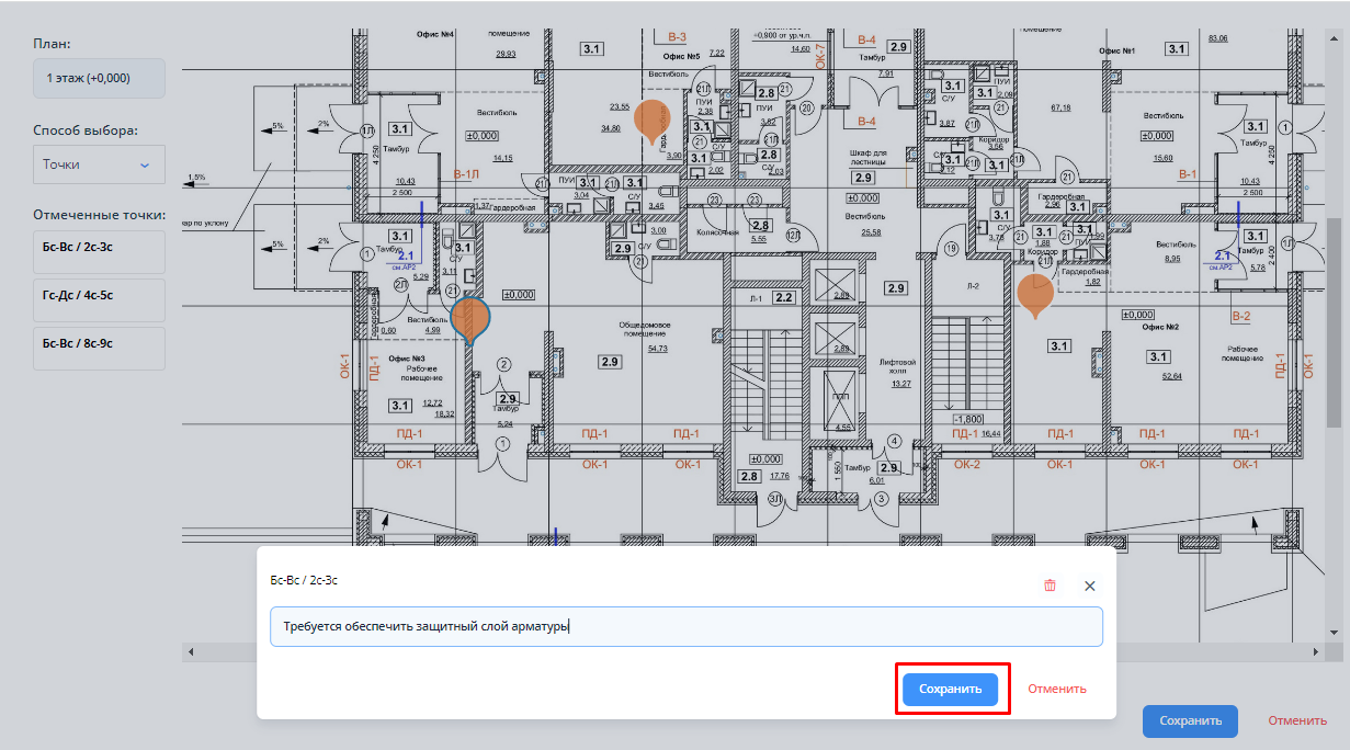 Суть: функционал позволяет оставлять текстовые комментарии к местоположениям при создании нарушений и осмотров, а также просматривать эти комментарии на странице плана.